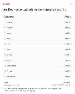 Par exemple pour un achat de 428€ effectué le 11 décembre 2025, vous serez débité 12 fois suivant l’échéancier suivant :