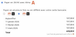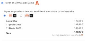 Le paiement en 3 ou 4 fois sans frais est accessible sur le web pour toutes les commandes de cent (100 €) jusqu’à dix-mille Euros (10 000 €).