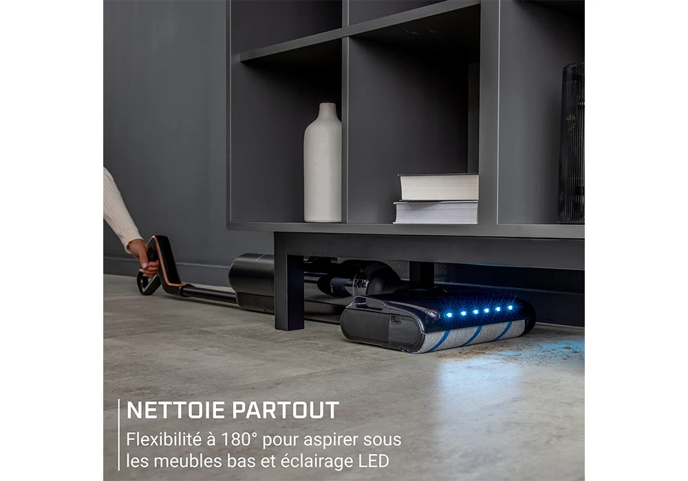 Pensé pour atteindre toutes les zones, il se glisse facilement sous les meubles grâce à sa conception plate. Son éclairage LED permet de repérer la poussière dans les endroits sombres, tandis que sa brosse nettoie efficacement le long des murs et des plinthes.