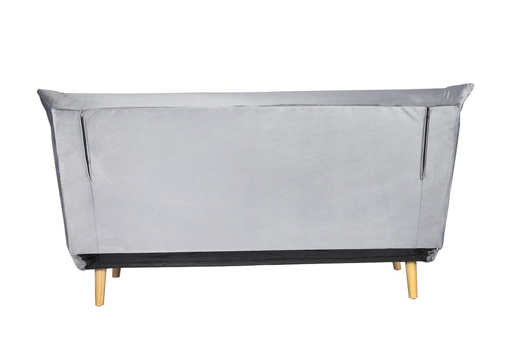Structure en panneau de particules, assise mousse en polyuréthane, matelas HD 25kg recouvert d’une housse en tissus microfibre velvet coloris gris, rose, bleu et vert. Piétement en BOIS HÊTRE MASSIF.