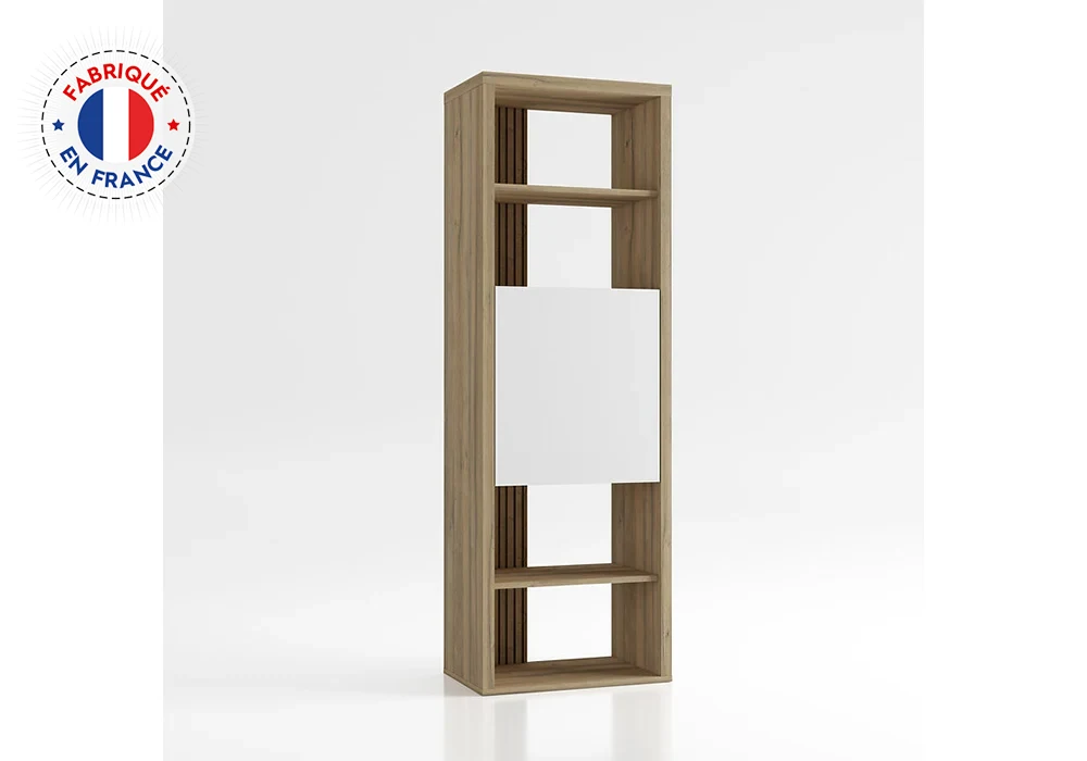 Dotée d’une porte centrale en laque brillante, cette bibliothèque dissimule un espace de rangement fermé avec tablette, parfait pour organiser vos objets en toute discrétion. Les niches ouvertes, équipées de tablettes finition bois clair, offrent une solution de rangement polyvalente et décorative.