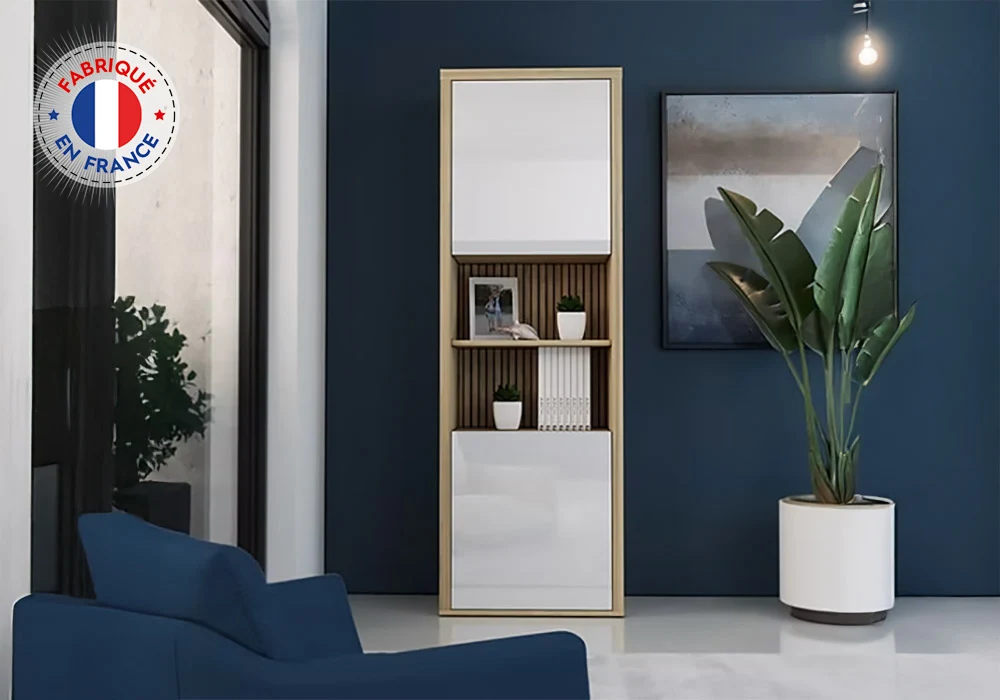 Dotée de 2 portes en laque brillante, cette bibliothèque dissimule un espace de rangement fermé avec tablette, parfait pour organiser vos objets en toute discrétion. Les niches ouvertes, équipées de tablettes finition bois clair, offrent une solution de rangement polyvalente et décorative.