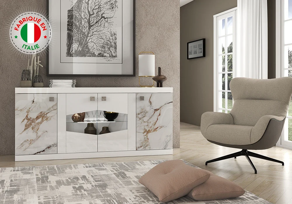 Les façades effet marbre beige verni polyester apportent une touche de raffinement minéral, tandis que les poignées en métal chromé soulignent le caractère contemporain du meuble. L’intégration d’un éclairage LED crée une ambiance chaleureuse et met en valeur vos objets décoratifs.