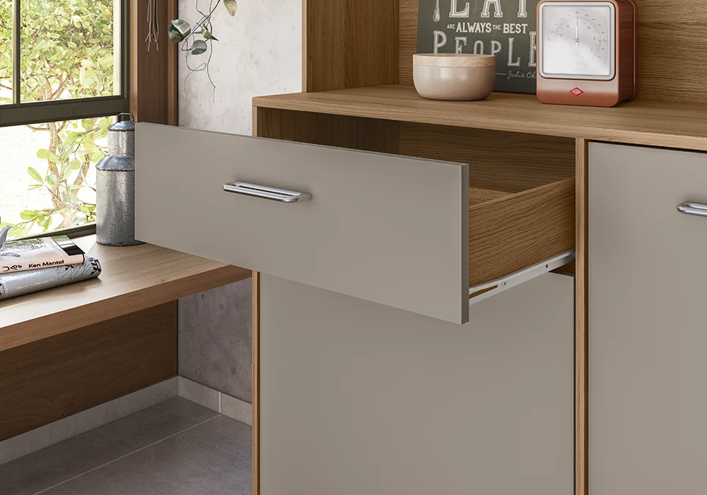 Le tiroir central offre un espace supplémentaire idéal pour les couverts et petits objets, garantissant une organisation claire et optimale.
