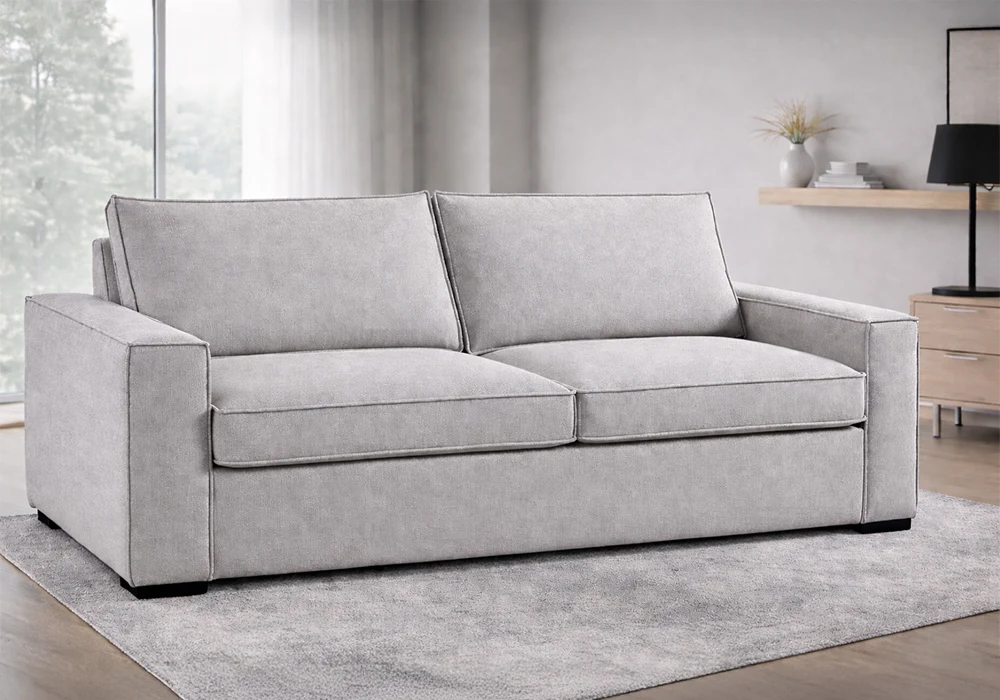 Sa structure en aggloméré épaisseur 18 mm, renforcée par des bandes en hêtre et sapin, garantit solidité et durabilité. L’assise en mousse polyuréthane et mousse à mémoire de forme (25 kg/m³) ainsi que le dossier en polyuréthane (18 kg/m³) assurent un confort agréable au quotidien.