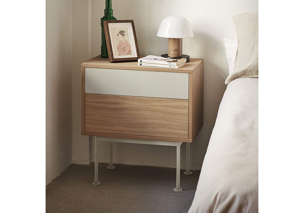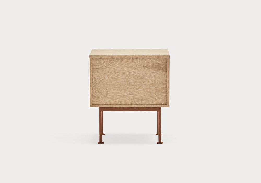 Avec son placage en chêne, le chevet Yoko combine le côté naturel du bois avec des détails en couleur, ce qui le rend parfait pour s’intégrer dans chaque ambiance. Yoko est en placage de chêne à l’exception des façades colorées, en MDF laqué. Les pieds sont métalliques et laqués de la même couleur que les façades.
