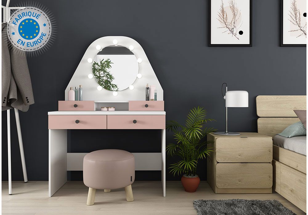 Craquez pour le style rétro de la coiffeuse Star avec son grand miroir rond éclairé par des ampoules, elle apportera charme et élégance à votre chambre. Ses 4 tiroirs de rangements rose apporteront de la douceur à ce meuble et vous permettront d’organiser tout votre nécessaire de beauté.