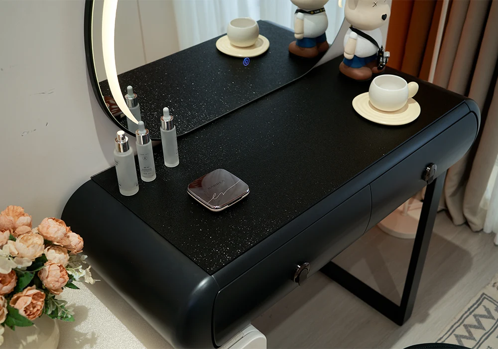 Dotée de 5 tiroirs, cette coiffeuse offre une organisation simple et efficace pour tous vos produits : maquillage, soins, accessoires et bijoux trouvent facilement leur place. Sa large surface de travail, compacte mais bien pensée, permet de garder l’essentiel à portée de main tout en optimisant l’espace.