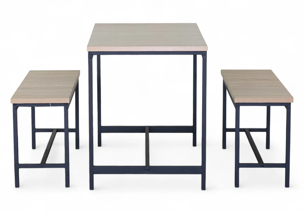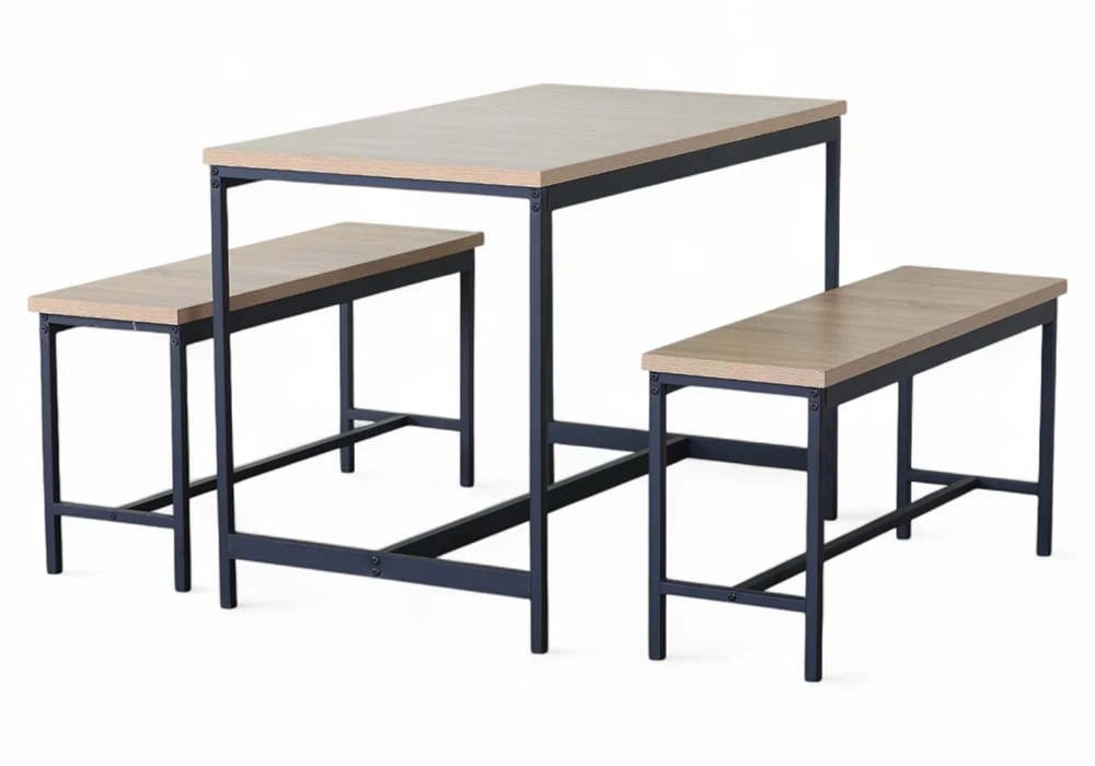 Composé d’une table rectangulaire et de deux bancs assortis, il repose sur une structure en métal coloris noir qui assure une stabilité durable et affirme un style industriel sobre et contemporain. Les plateaux en MDF finition chêne OAK apportent une chaleur boisée et une texture authentique, créant un contraste harmonieux entre matières brutes et lignes épurées.