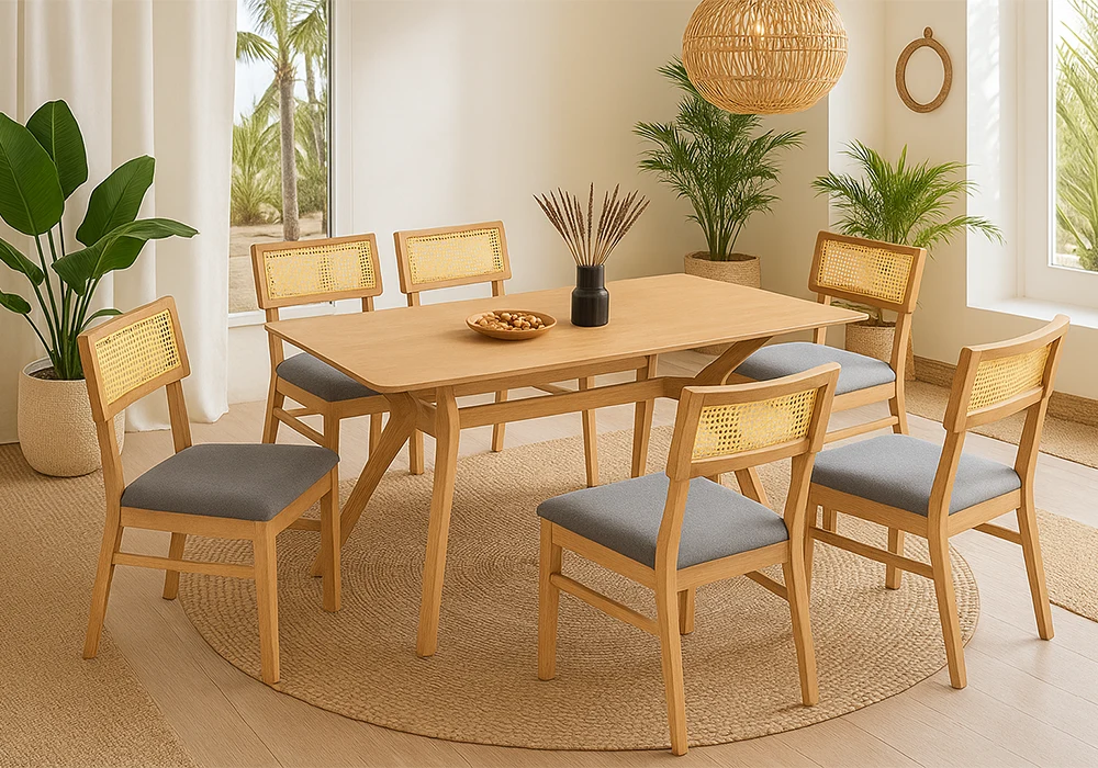 Ensemble Table à Manger avec 6 Chaises – Bois d’Hévéa Naturel & Tissu Gris