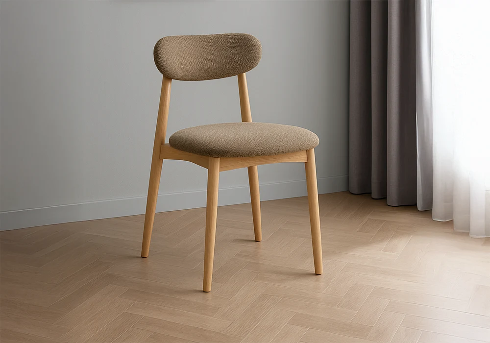 Les chaises, aux lignes épurées, sont garnies de mousse polyuréthane pour une assise douce et soutenue. Leur revêtement en tissu marron clair, à la teinte naturelle et chaleureuse, s’harmonise avec tous les styles décoratifs, du scandinave au rustique chic