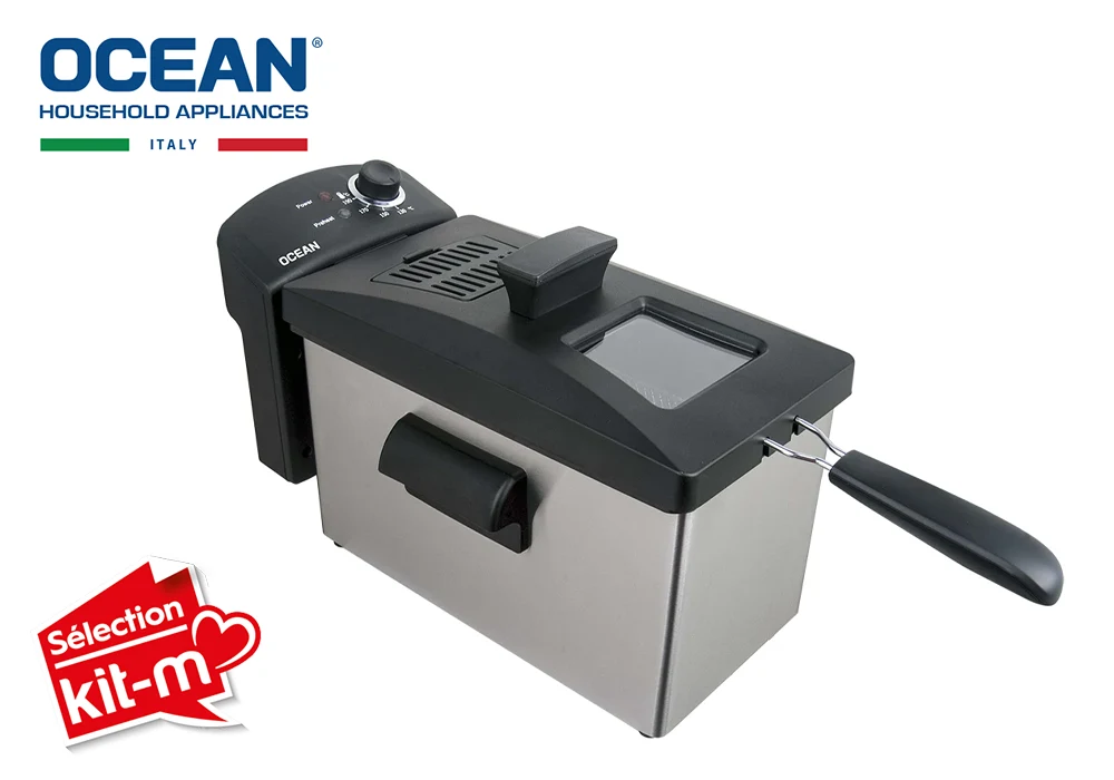 La friteuse électrique Ocean Semi-Pro Inox est conçue pour offrir une cuisson rapide, efficace et croustillante à la maison. Grâce à sa puissance élevée de 2750 W, sa cuve de 4 litres et son thermostat réglable jusqu’à 200 °C, elle permet de préparer facilement frites, beignets, poissons frits ou tempuras avec un résultat proche d’une friteuse professionnelle.