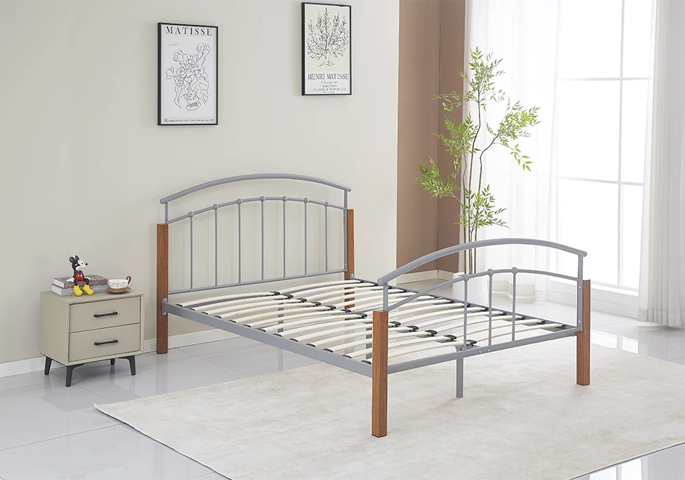 Structure en métal gris et BOIS d’HÉVÉA, lit vendu AVEC SOMMIER, SANS MATELAS.