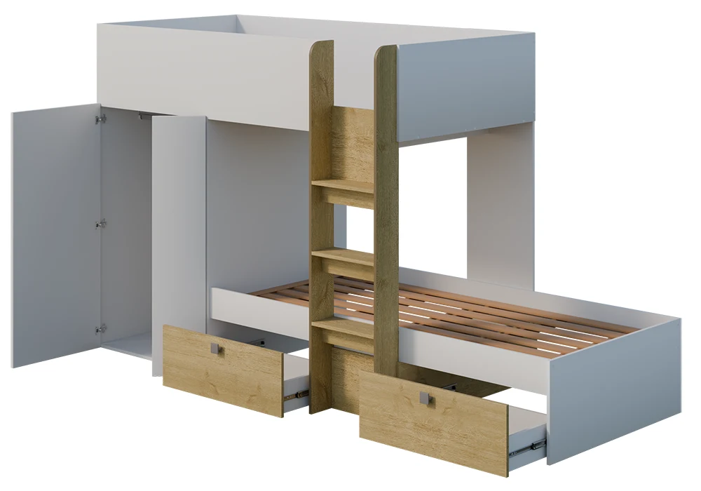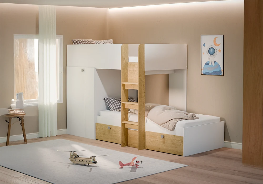 - Rangements intégrés : Armoire avec portes et 2 tiroirs sous le lit inférieur