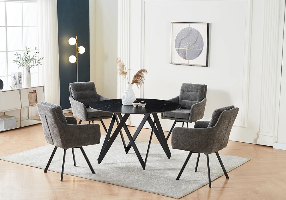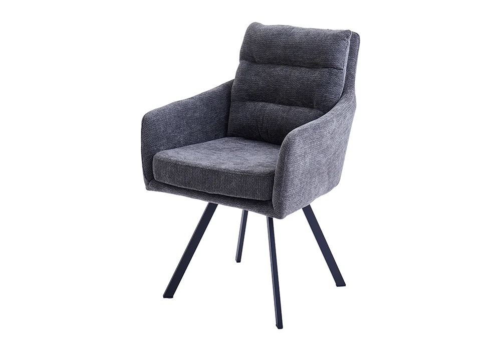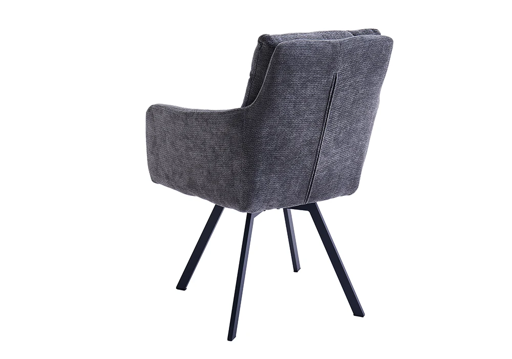 La structure en métal avec finition peinture noire assure une excellente robustesse et une stabilité optimale au quotidien. L’assise et le dossier sont rembourrés en mousse et recouverts d’un tissu texturé gris, offrant un confort agréable et durable.