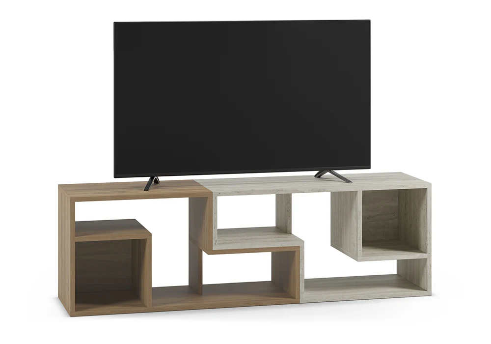 Conçu avec une structure en panneau de particules et MDF, recouverte de papier décor coloris chêne et travertin, ce meuble TV offre stabilité, solidité et durabilité, tout en mettant en valeur un rendu haut de gamme et contemporain.