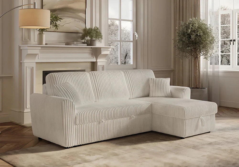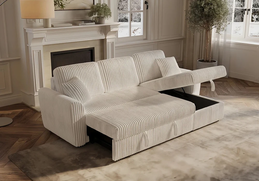 Fonctionnel, le salon SABRA se convertit rapidement en lit en quelques secondes, idéal pour recevoir des invités. Il intègre également un grand coffre de rangement sous la méridienne, parfait pour optimiser l’espace. Grâce à sa méridienne réversible, il s’adapte facilement à l’agencement de votre pièce, faisant de ce modèle une solution à la fois pratique, confortable et esthétique.
