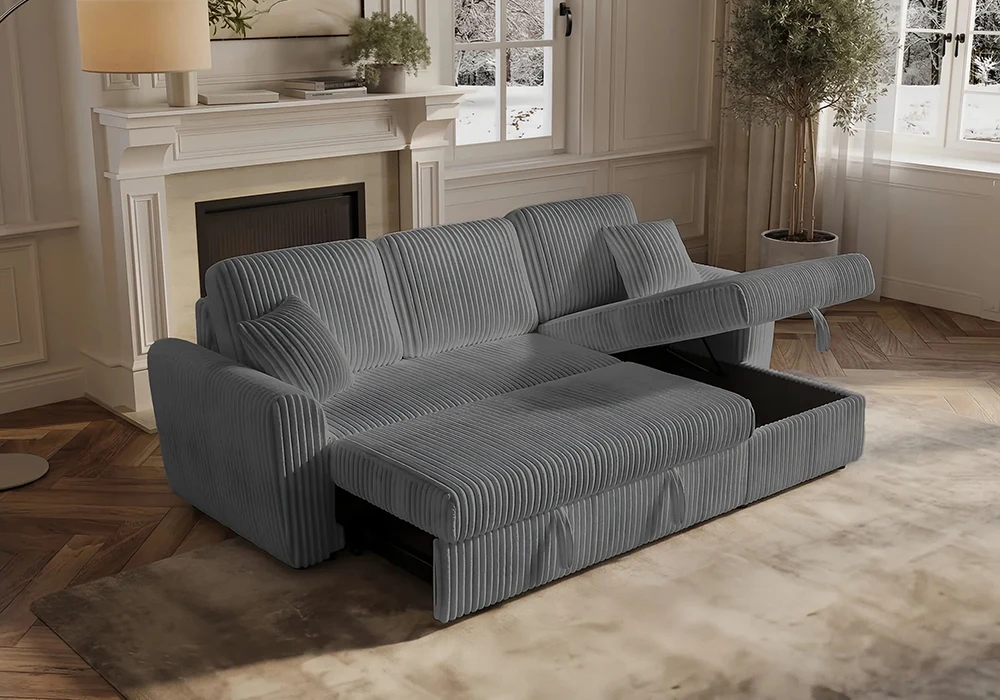Fonctionnel, le salon SABRA se convertit rapidement en lit en quelques secondes, idéal pour recevoir des invités. Il intègre également un grand coffre de rangement sous la méridienne, parfait pour optimiser l’espace. Grâce à sa méridienne réversible, il s’adapte facilement à l’agencement de votre pièce, faisant de ce modèle une solution à la fois pratique, confortable et esthétique.