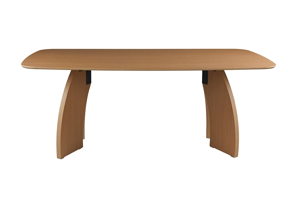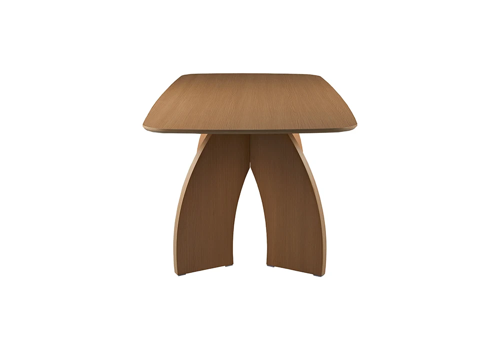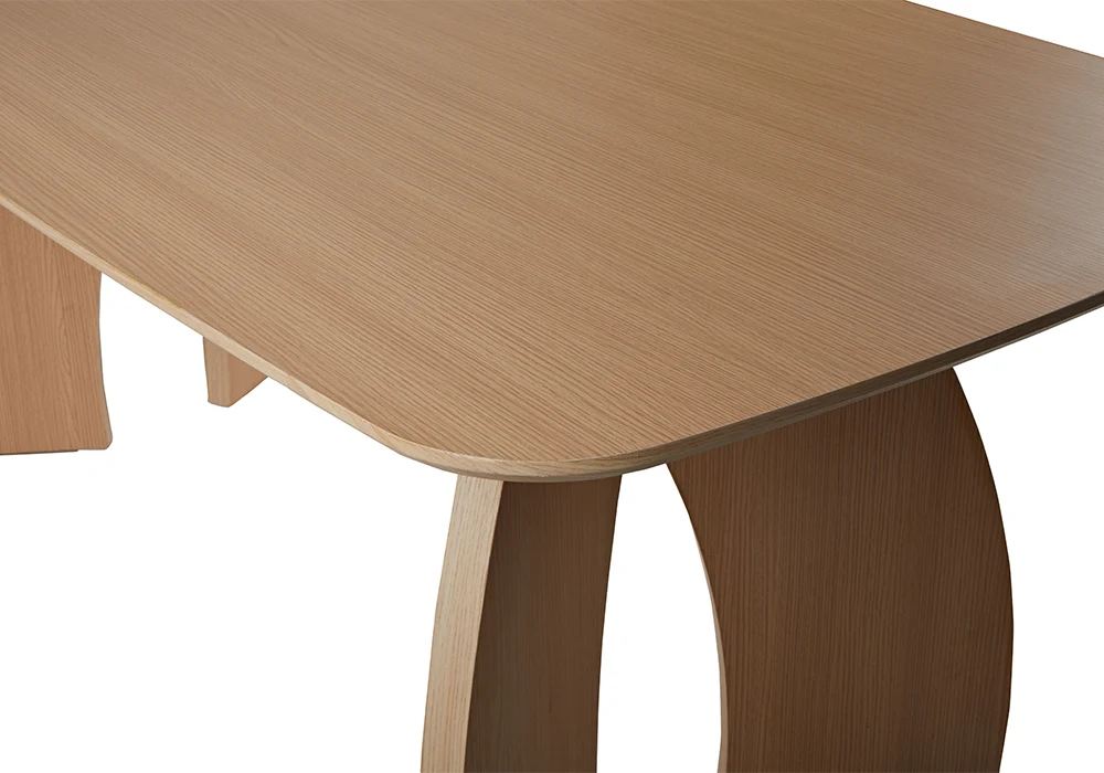 Structure en MDF avec finition décor chêne naturel, revêtement mélaminé. Piètement en panneaux MDF cintrés assurant stabilité et design contemporain. Plateau aux bords arrondis avec finition lisse et résistante.