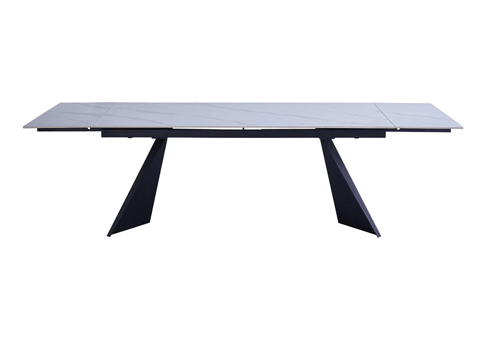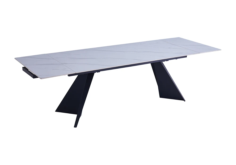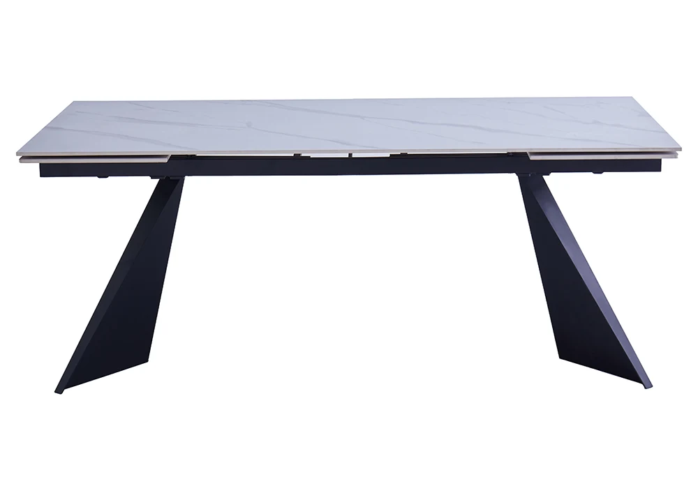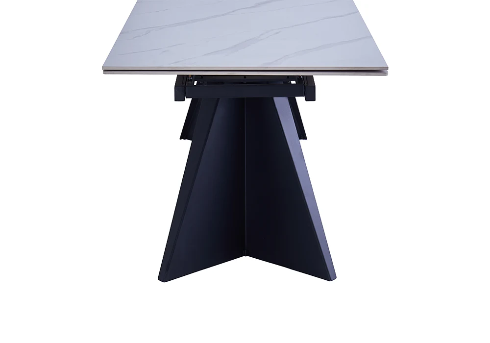 Son plateau en céramique effet pierre blanc offre une excellente résistance aux rayures et à la chaleur, tout en étant facile à entretenir. Le piétement en métal noir assure une robustesse et une stabilité optimale, créant un contraste moderne et raffiné.