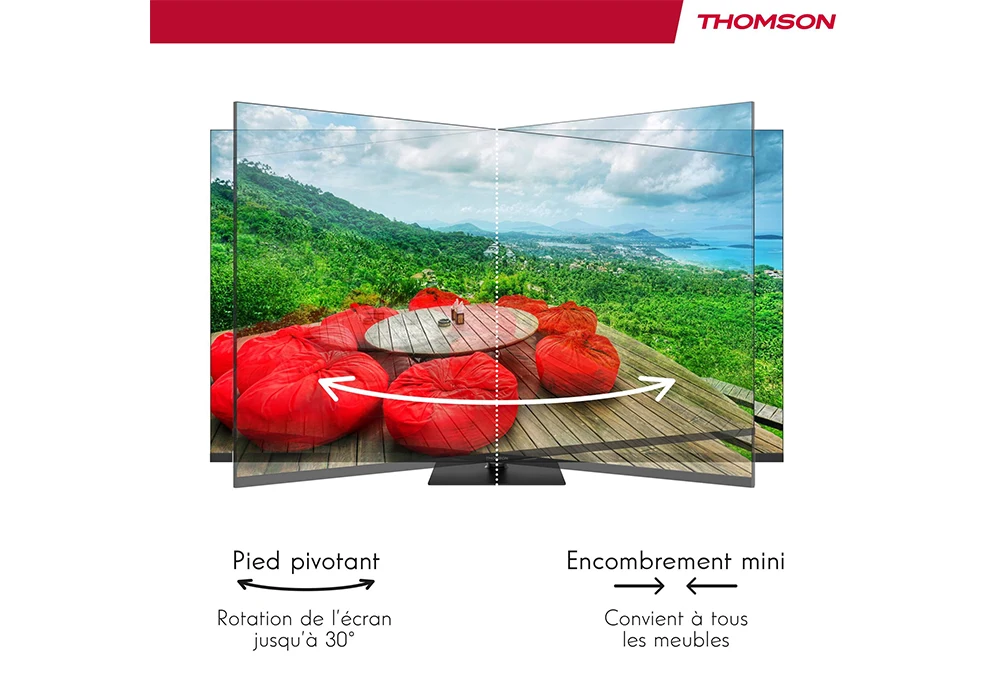 Avec son cadre fin et son pied central pivotant, ce téléviseur s’intègre élégamment dans tous les intérieurs et vous permet d’ajuster l’angle de vision pour un confort optimal.