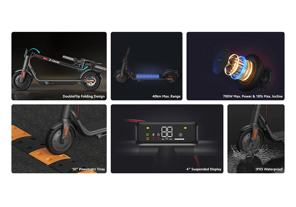 La NAVEE V40i Pro est équipée d’un moteur de 350 W (jusqu’à 700 W en puissance maximale) offrant une accélération dynamique et une conduite stable même sur les pentes.
