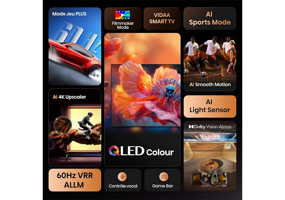 Pensé pour être ultra-complet, il combine qualité d’image, son immersif et fonctionnalités intelligentes pour répondre à tous les usages : films, streaming, sport ou gaming.