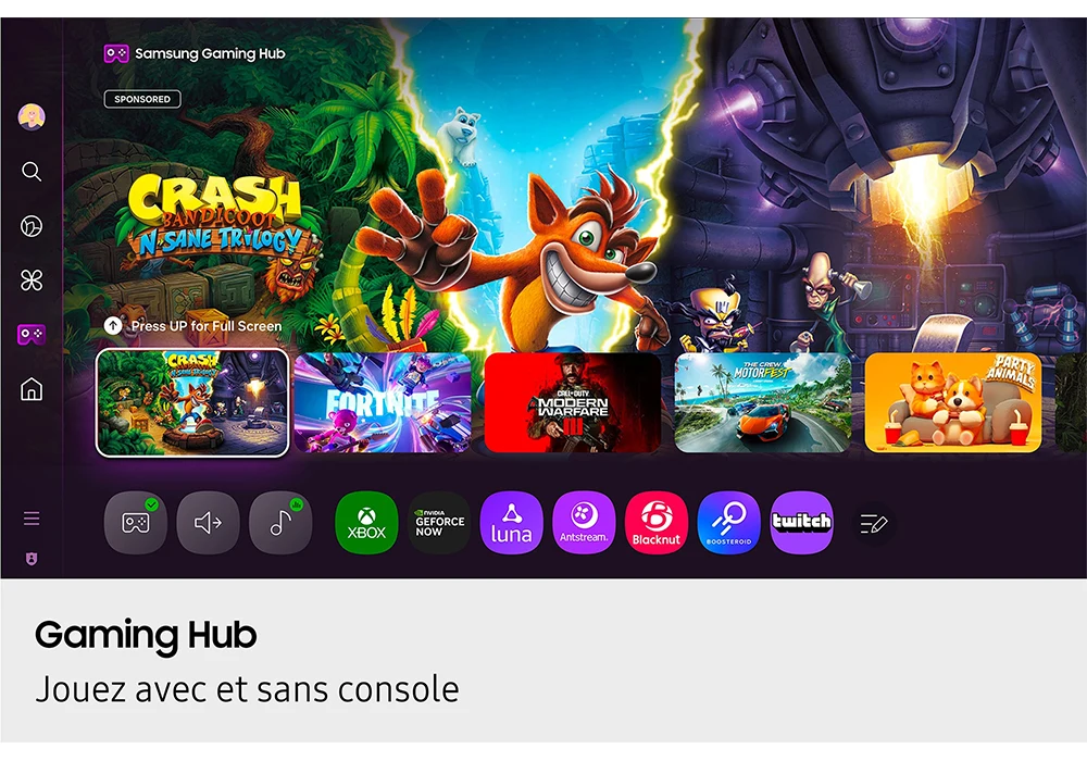 La Samsung TQ50Q7F intègre le Samsung Gaming Hub, donnant accès aux consoles connectées et au cloud gaming (Xbox Cloud Gaming, GeForce NOW…).